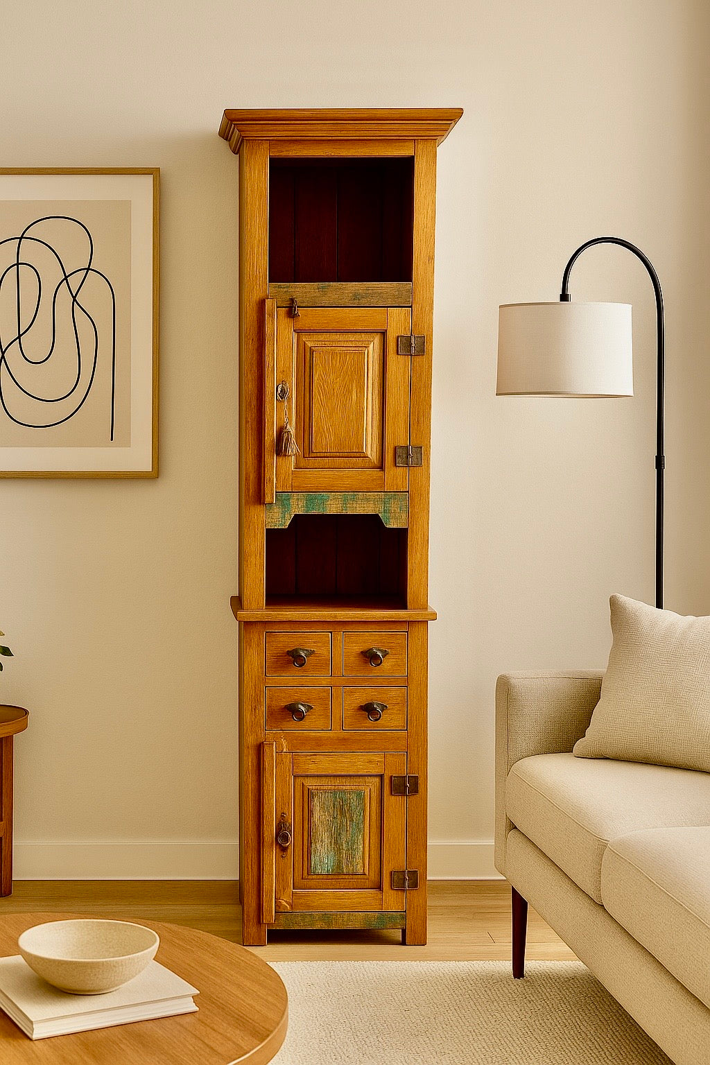 Bibliothèque en teck massif avec 4 tiroirs et 4 casiers. Peut servir pour un rangement très varié d'articles comme la vaisselle, le linge, les livres, CD, bibelots, BAR, garde manger, ou même dans une salle de bain pour serviettes et autres. Fabriqué à la main en Inde.