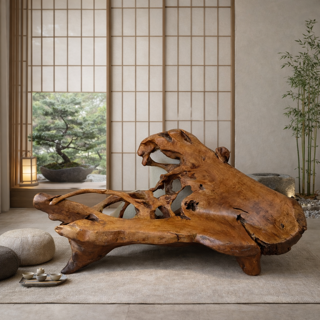 Chef-d’œuvre de design organique, ce canapé monumental est taillé dans une racine de bois massif rare, révélant une présence sculpturale d’une puissance exceptionnelle. Véritable pièce de collection, il transcende la frontière entre mobilier et œuvre d’art.