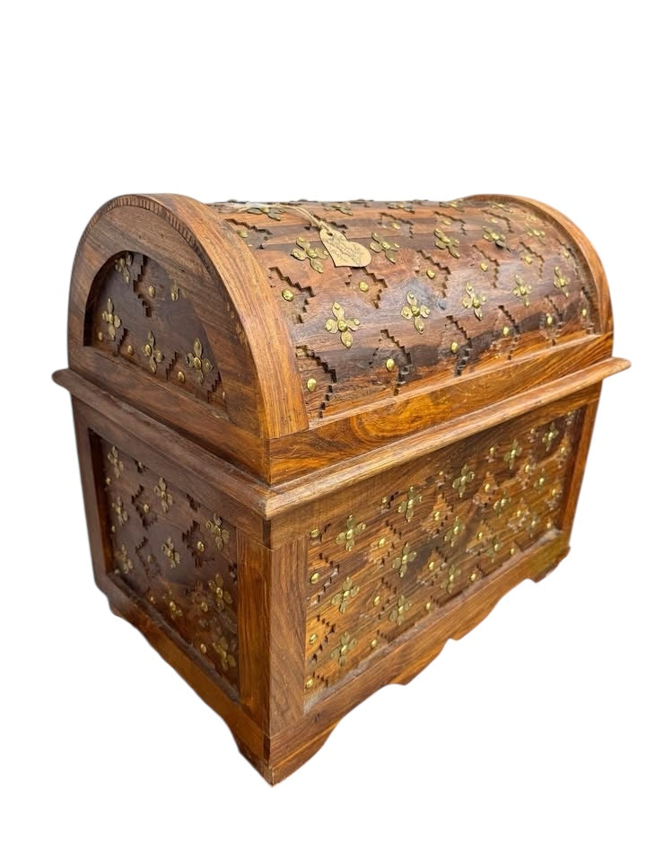 Coffre en bois de rose. Ses ornements en métal doré et son ciselage en font une pièce magnifique. Pour un rangement très varié d’articles et la décoration. Fabriqué à la main en Inde. Mesures: Hauteur= 24 pouces Largeur= 27 pouces Profondeur= 17 pouces