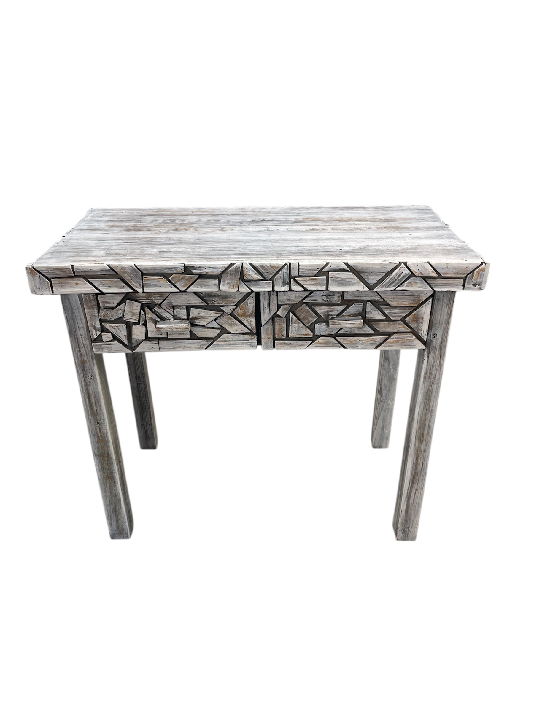 Console/bureau en bois d’albasia blanchi à 2 tiroirs, entièrement fait à la main à Bali.