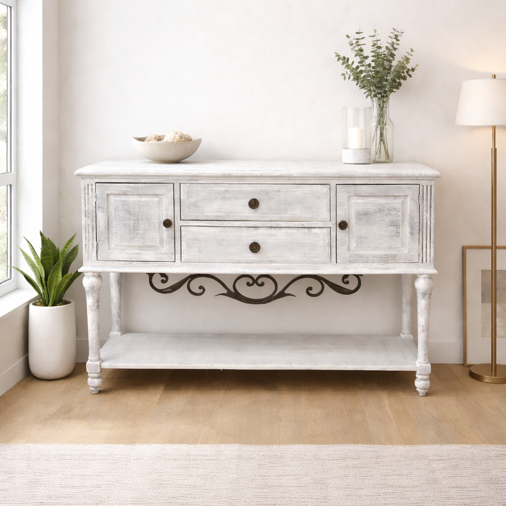 Console/crédence en bois de teck blanchi avec beaucoup de rangement, fait à Bali.