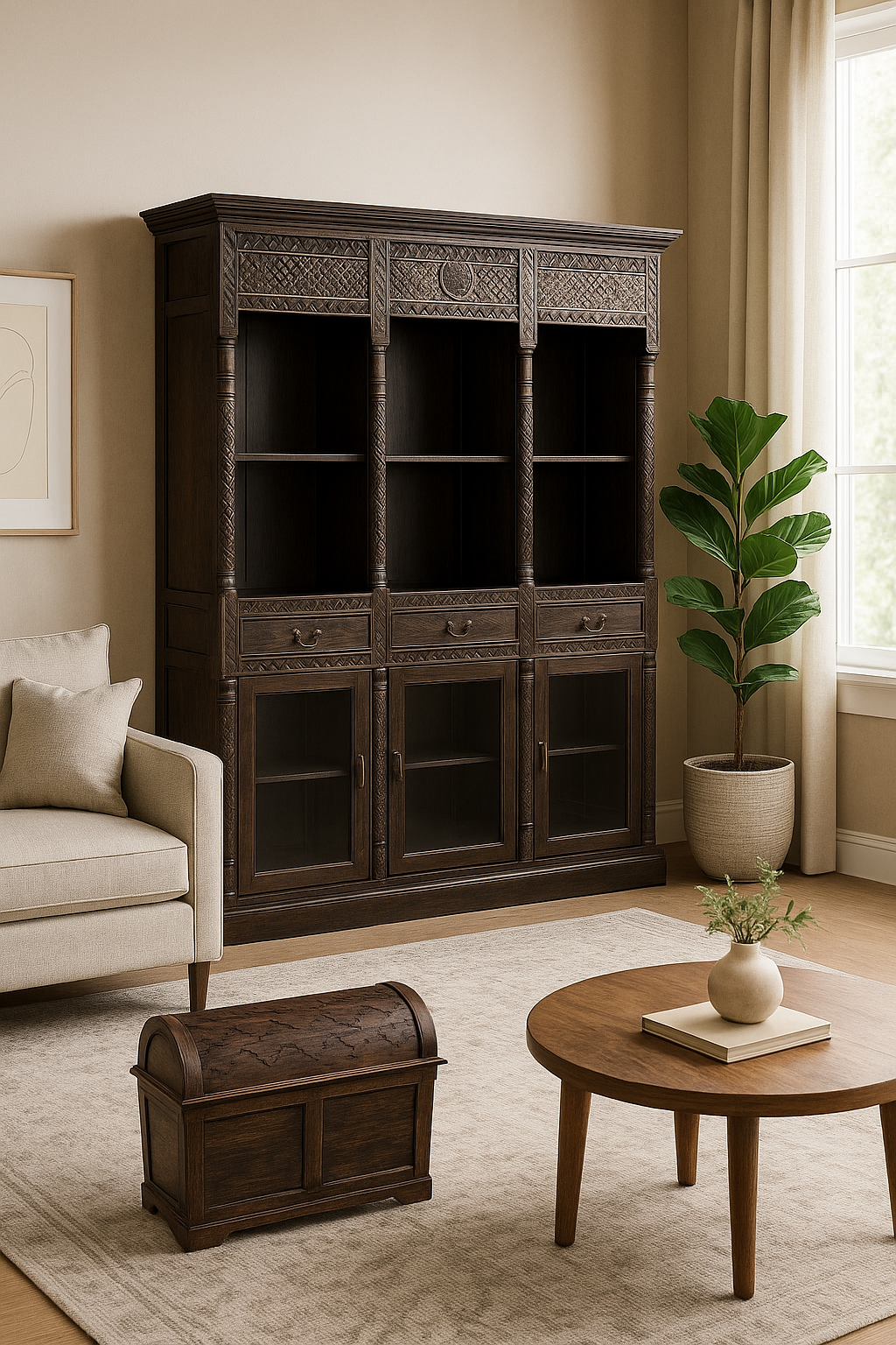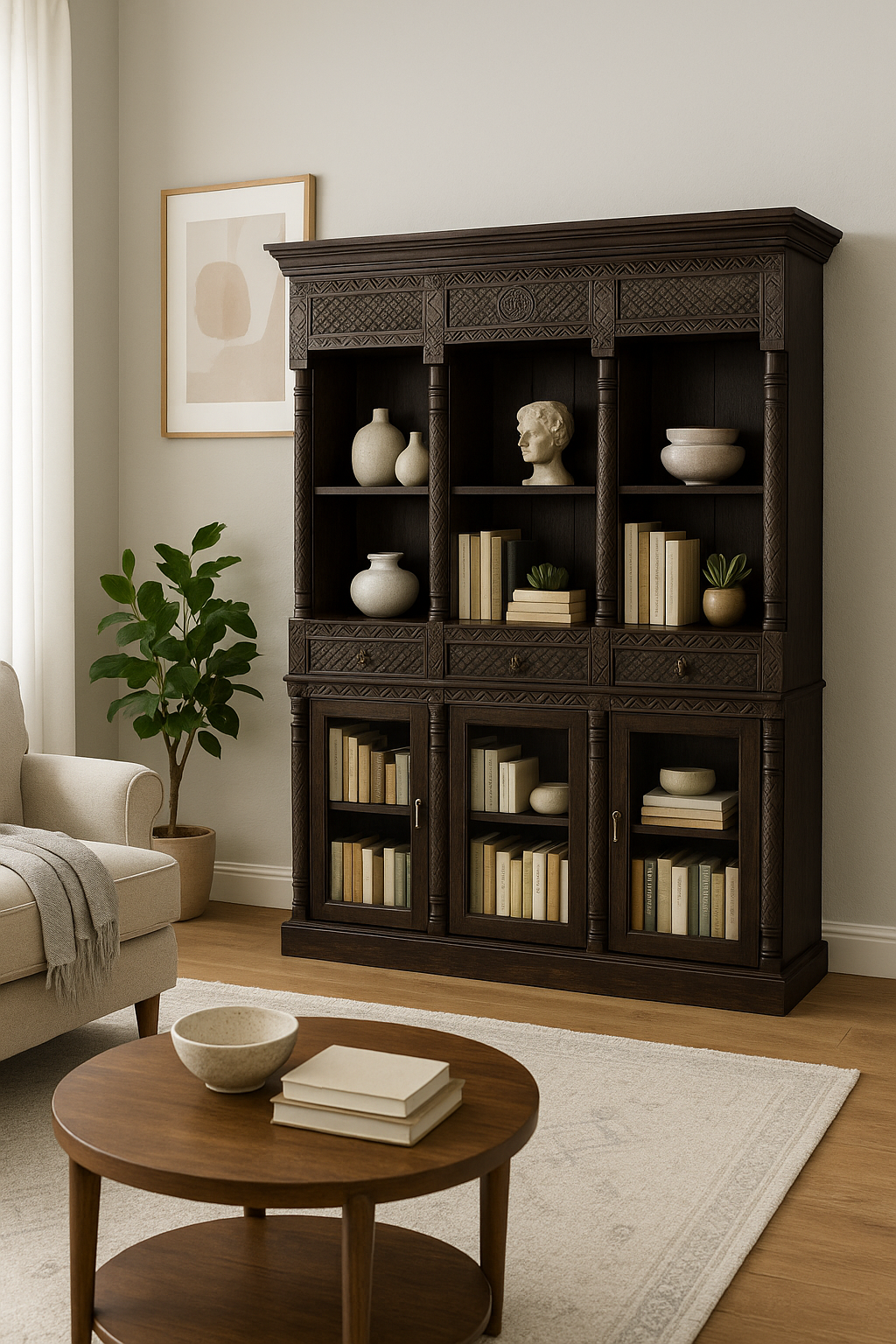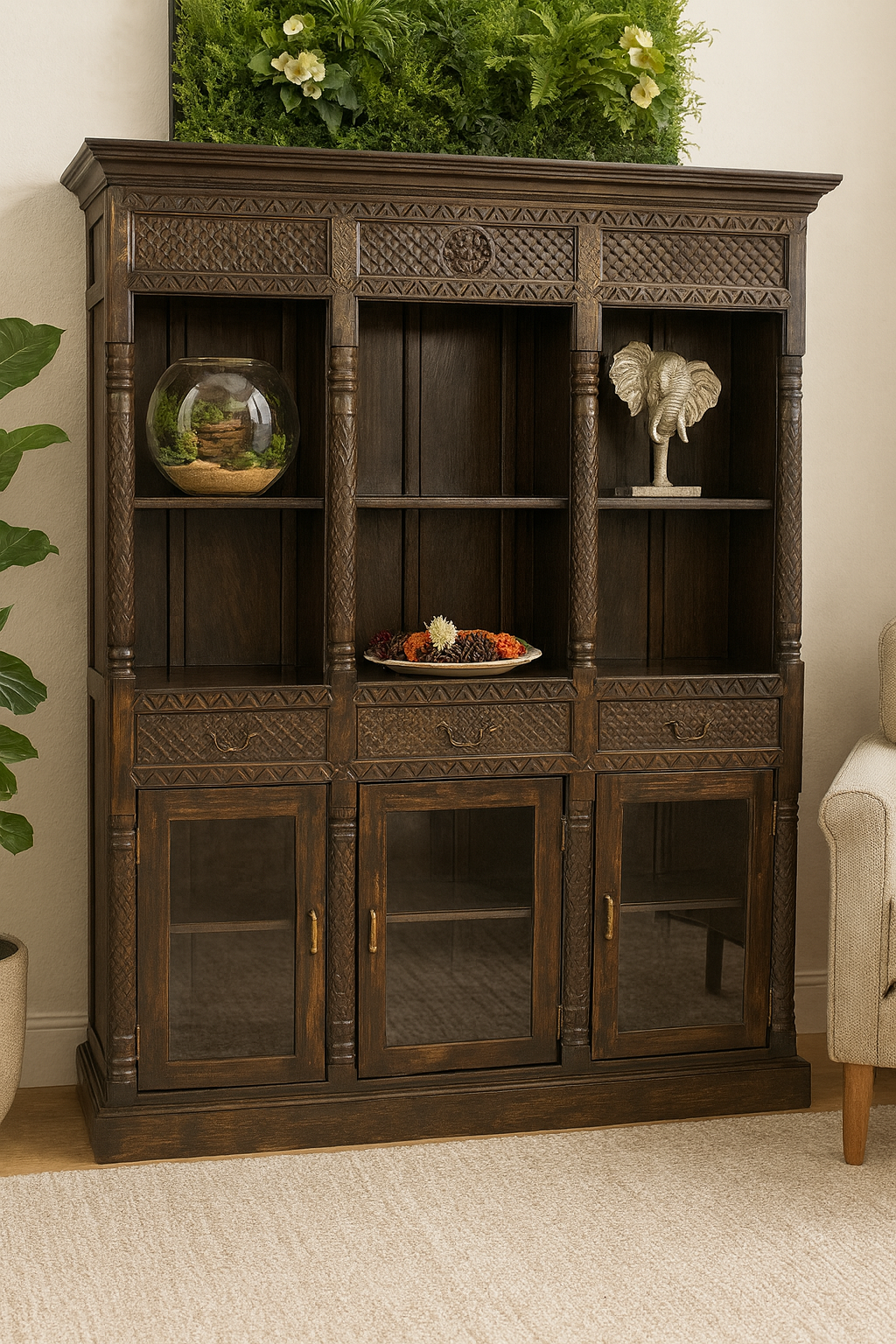 Bibliothèque en bois d’acacia sculpté avec étagères, tiroirs et portes vitrées en bas. Fabriquée à la main en Inde. Dimensions: Longueur= 59 pouces Hauteur= 78 pouces Profondeur= 14 pouces