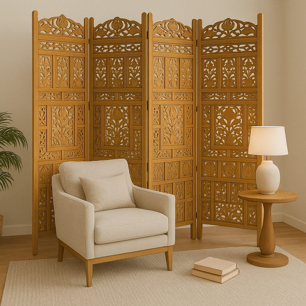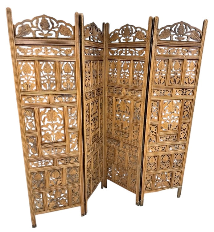 Paravent de 4 panneaux en bois de teck entièrement sculpté à la main en Inde. Dimensions de chaque panneau: Largeur= 20 pouces Hauteur= 72 pouces